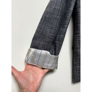 Made in Italy of virgin wool with contrast cotton lining and striped satin cuffs. Single breasted, three button. Three pocket front and interior pockets. Notch lapel. Center-back vented hem. Slightly oversized fit. Dry clean only. Please note, there are two pockets on the right side of this blazer and one on the left. This differs from the model photo.