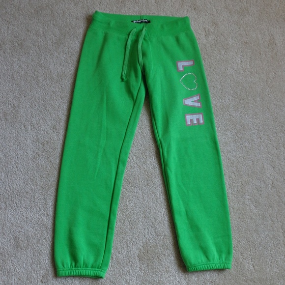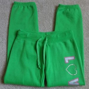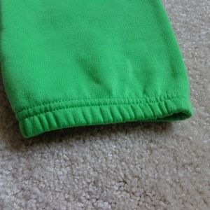 DETAIL: Green drawstring lounge pants with elastic ankles. Soft and comfy. Perfect for lounging. Size XS.