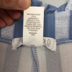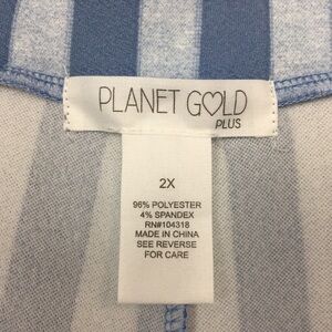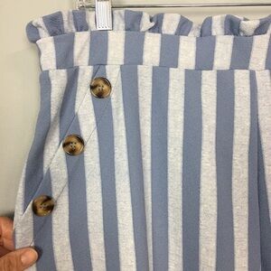 Vertical stripes of gray blue and light blue. Buttons detail along faux pockets at hips. 96% polyester, 4% spandex. Machine wash cold, tumble dry low.