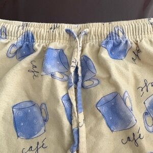 Stylish pajama pants featuring a playful blue coffee mug print on a yellow background.