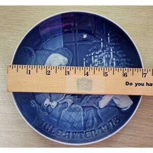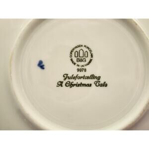 Nice collector plate Copenhagen - Bing & Grondahl. This is a plate is 7" diameter blue Christmas plate. This plate is titled "A Christmas Tale" "1978". It has the name of the scene in English and in Danish. This plate has a grandmother reading a Christmas story to two grandchildren in front of a decorated Christmas tree. The plate has two holes for hanging on the wall. This plate is made in Denmark and has the B&G marking along with a number "9078".