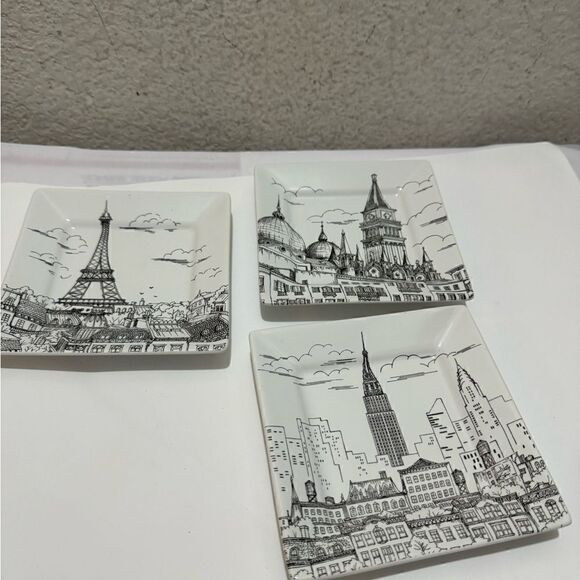 PLATES-BLACK WHITE CITY SCENE-SQUARE-1 LARGE 3 SMALL-222 FIFTH-MATCHING SET