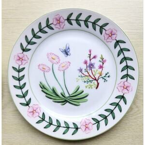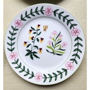 Set of 4 salad/dessert/buffet plates by I. Godinger & Co. These are botanical theme plates that measure 7.5" in diameter. Each plate has a different floral design. Three of the plates have a butterfly and one has a dragonfly. They all have matching design around the edge. They are in very good condition, like new. There are no utensil markings on the plates. Very pretty set of plates for your table or buffet setting.