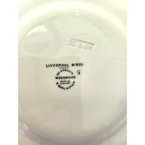 Small plates by Wedgwood of Etruria & Barlaston - Made in England. Discontinued pattern. These are 6" diameter plates, probably used as butter plates in the set. Each plate has the same pattern, Liverpool Birds. They are a light cream color plates with black design of birds on the front. Very English type design. Each plate has the makers mark printed and an impressed mark on the back, which "I think" is the date it was made. One is easier to make out than the other. One of the plates has a surface crack on the front and back. It is noticeable with the eye, but is a very shallow crack. This same plate also has some wear on the wing of the flying bird. SEE LAST 3 PICTURES. The other plate does not appear to have any issues. Nice collectible set of small Wedgwood plates.