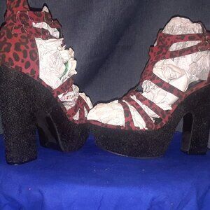 RED LEOPARD FAUX SUEDE STRAPS / FAUX FUR PLATFORM HEEL BLACK