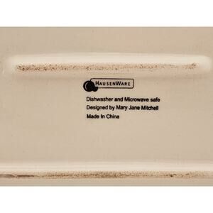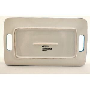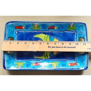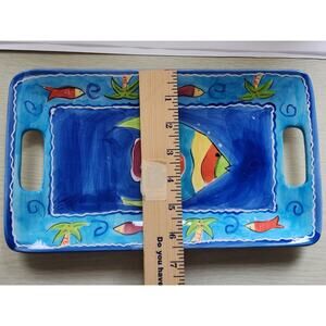Tropical/fish/sea themed ceramic dish. This is by HausenWare designed by Mary Jane Mitchell. It is painted in colors of blue with a large striped fish in the middle and smaller fish and palm trees along the edges. There are holes on the ends for easy carry. It is a whimsical painted piece. It could be used in a variety of ways - a serving plate, a display plate, a trinket dish for bracelets, watches, keys or whatever else you can think of. It is bright and colorful. It measures 11.5" x 6.5".