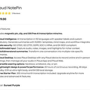 PLAUD Note Pin in snset purple. Includes box, charging port and instruction booklet. Used twice, like new.