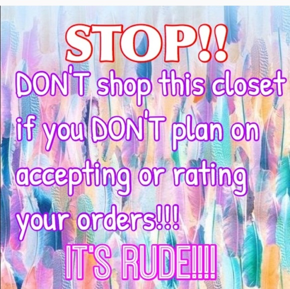 I am so tired of people buying my items and then have the nerves to not even ACCEPT OR Even RATE the orders/packages. Anyone that does this will definitely be BLOCKED from FUTURE PURCHASES from my Ra Custom Closet. NO EXCEPTIONS!!! I even go as so far as to ENCLOSED ExtraTHANK YOU FREE GOODIES GIFT ITEMS and a thank u note in the packages and i don't even get a thanks so much for the gifts or NOTHING!! IT IS RUDE AND UNFAIR TO US POSHMARK SELLERS!!! THANKS!!