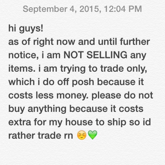 @kikihav sorry for confusion but im not selling my items. you should always consult the seller before buying bc then you would've known nothing of mine is for sale rn im only trading. ill have to cancel your purchase. thanks!
