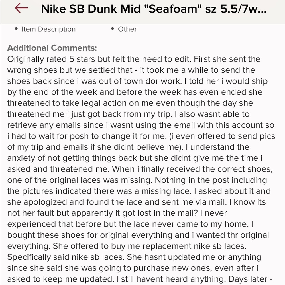 Yes. I agree there are two sides. However, the transaction was technically completed the day she received the shoes. Getting the laces was not an obligation but as a courtesy. I offered a full refund for the hassle instead of prolonging the wait for laces. She did not take the refund. I also agree with the star rating I was given due to the miscommunication, however like she said. There are two sides.