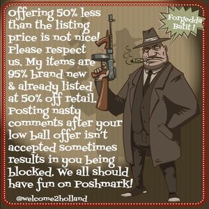 I will gladly except reasonable offers & I'm sure most if not all sellers will too. I am a seller & the buyer. I'm very open-minded, optimistic and a realist. Sellers already have to give 20% of their sales to Poshmark so lowballing offers usually aren't excepted. Sometimes sellers except a reasonably lower price based on how fast they want to move items in their closet. I love Poshmark & I know you do too. Together we can make Poshmark better than ever!