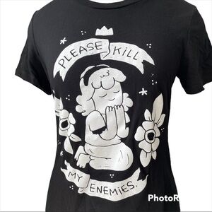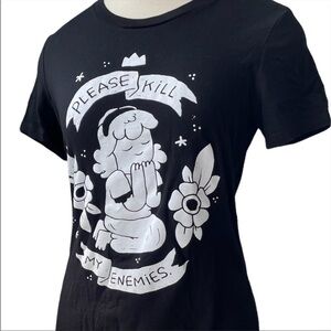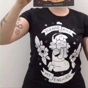 White ink on form fitting 100% cotton black t-shirt. Artwork by Michael Sweater from the Please Destroy My Enemies book of funny comics. It's basically new, I bought it and just stored in my dresser.
