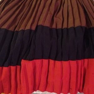 Classic and classy, this brown, blue, and red pleated dress is sure to make an impression when you walk into a room. Adjustable straps and stretchy top. Goes well with black wedge sandals and gold glitter purse -also for sale- which can be bundled for a complete ready to step out on the town outfit.