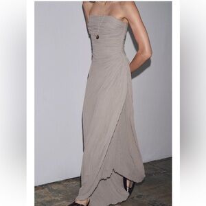 This elegant strapless dress is perfect for any occasion. The soft gray color adds a touch of sophistication to your wardrobe.