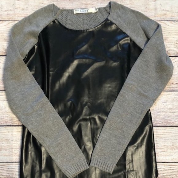 Gray sweater with black pleather front. Ribbed knit long backing.