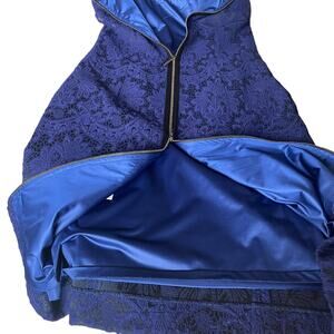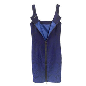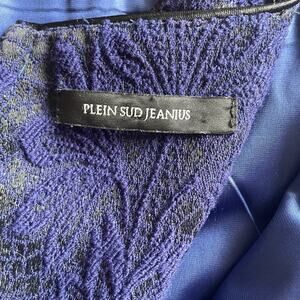 PLEIN SUD JEANIUS Women's Size US 8 Royal Purple Violet Lace Jacquard Sleeveless Lined Cocktail Dress. Full Back Zipper Detailing. Square Neck. Knee Length. Made in Italy.