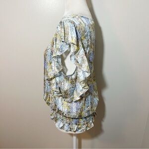 PLEIONE Blue Yellow Floral Smocked Flutter Sleeve Sides Blouse - LARGE