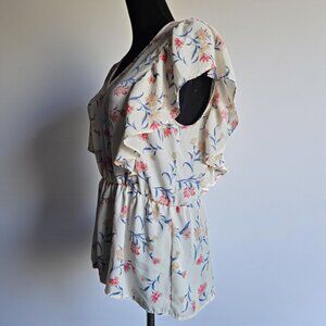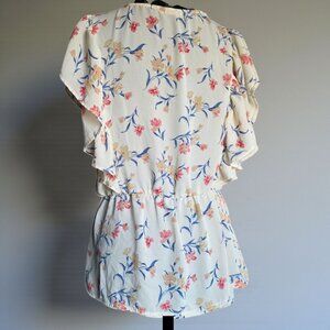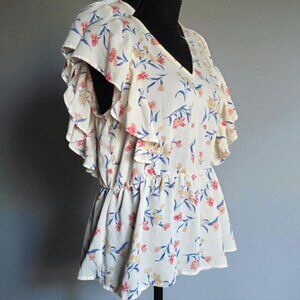 PLEIONE (MED) Peplum Ivory Floral V Neck Ruffle Sleeve Blouse