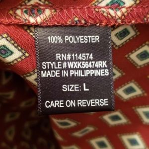 Gorgeous Pleione ruffle front blouse with sheer panel at back. Rust color with geometric pattern allover.