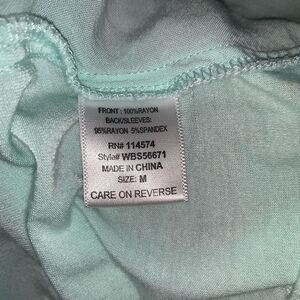 V neck front with rollable sleeves, Jersey like feel made of rayon and spandex. Machine washable. Size M. Small blemish on back top (see pic).