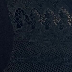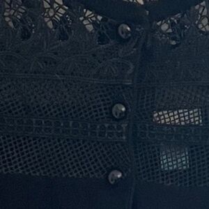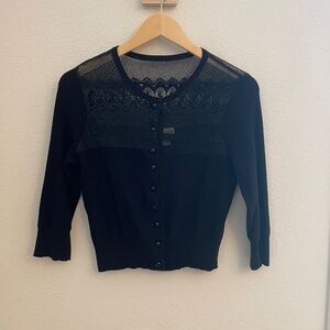 PLENTY BY TRACY REESE Cropped Tiny/Vintage Style Lace Cardigan Sweater. Black with Steel Gray lace. Size : Medium; Measurements: (approximate and taken with garment lying flat & unstretched): Width 19”; Length ( measure top of cardigan to bottom / back ) - 19”; Length from underarm to bottom - 10.5” 82% Cotton 18% Spandex. Condition: Excellent; gently worn; well maintained; no stains, marks, holes, pilling, or rips.