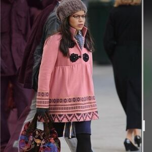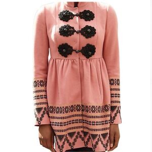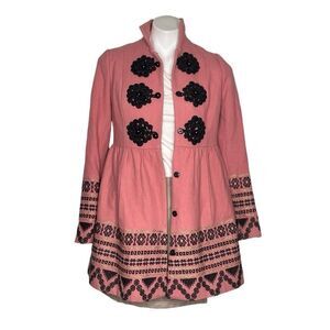 A bold folkloric pattern graces this princess-worthy jacket, dyed in a royal shade of pink and finished with ornate frog closures. Side slip pockets. Fully Lined. Embroidered design. Faux buttons Snap closure. Shoes light wear with no apparent flaws.