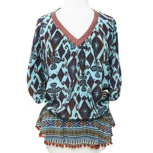 PLENTY TRACY REESE Colorful Tribal Pattern Peplum Boho Silk Pompom Trim Blouse
