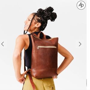 Stylish brown leather backpack with a front zip pocket. Perfect for everyday use.