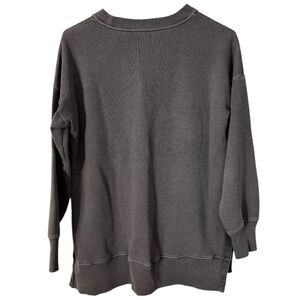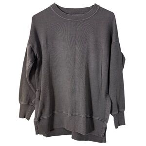 This Aerie sweater in a solid gray hue features a classic crewneck design with ribbed cuffs and hem for a touch of texture. Made from a soft knit material, it offers a relaxed fit perfect for everyday wear. Its simple and versatile style makes it an essential addition to any wardrobe.