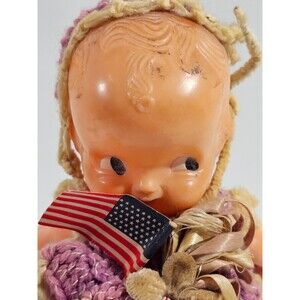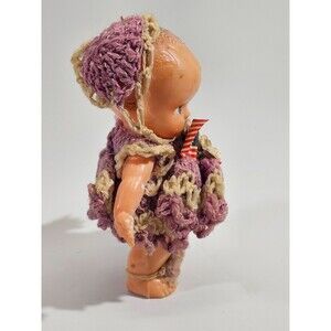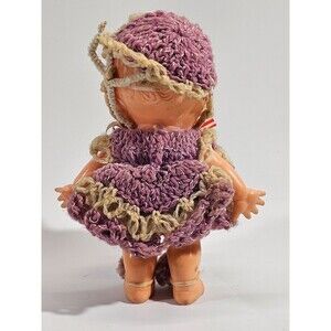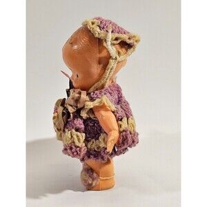 Measures approx 10"I believe this Kewpie doll is from Irwin Toy circa 1950s. It is hard plastic with frozen legs and jointed arms.She is dressed in a crocheted hat and dress complete with matching pom poms! This doll is a talcum powder dispenser. Three holes on top of her head allow you to shake out the powder. Doll is in great shape with some marks/dirt from age/use. She still contains some original talcum powder. Please see photos for details; what you see is exactly what you'll receive.