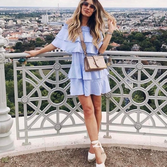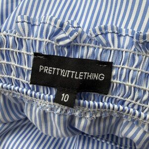 PrettyLittleThing blue and white striped ruffle multi tiered off the shoulder mini dress #preppy #summer