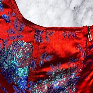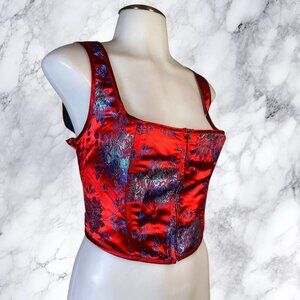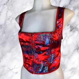 PLT PrettyLittleThing Red & Blue Floral Satin Brocade Zip Front Corset