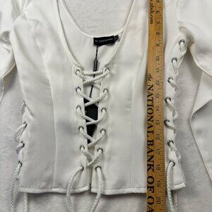 PLT WOMENS TOP SIZE 2 CREAM WOVEN LACE UP PLUNGE DETAIL LONG SLEEVE SEXY TOP NWT