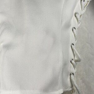 This white lace-up top features a structured corset-like design with long sleeves and a scoop neckline. The adjustable lacing adds a sophisticated touch, making it versatile for tailored styling options. Crafted by PrettyLittleThing, it offers a sleek and modern wardrobe essential.