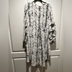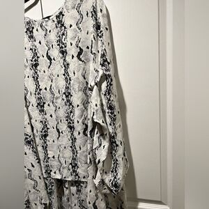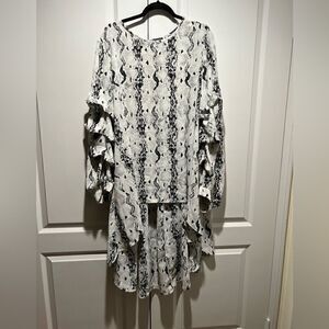 ANIMAL PRINT OF GRAY,BLACK,CREAM COLORS HI LOW, 100% POLYESTER, ROUCHED SLEEVES. GOES GREAT WITH BERMUDA SHORTS, JEANS OR LEGGINGS See last picture _ flaw unrouched sleeve