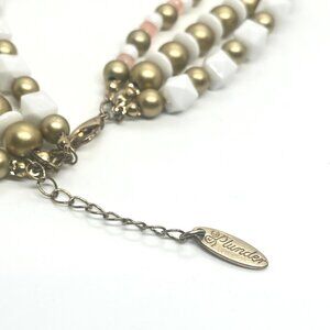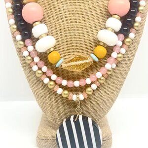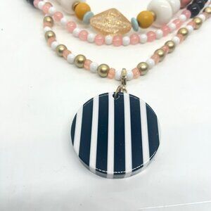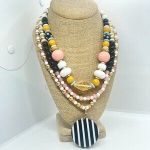 Super fun and funky PLUNDER MULTI STRAND LAYER POP ART NECKLACE BEADS STRIPE PENDANT ORANGE PINK. Signed Plunder on the jewelry tag. Measures approximately 18" around the neck, 12" total drop with pendant, pendant: 2.5" h x 1.75". Plastic fantastic pink, white, balck, orange, blue and gold acrylic beads and a removable found pendant with a unique striped design. This unique colorful necklace has shades of vintage 80s Memphis design, 60s pop art, vintage plastic fantastic and Palm Beach vibes! Super fun to add a pop of color and uniqueness to your outfits. Statement making.