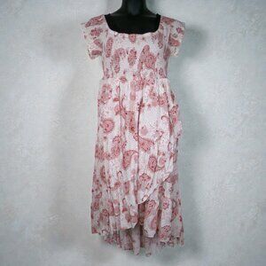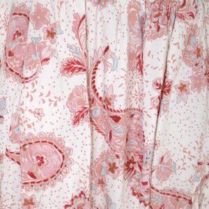 Model is 5'10" wearing size 1. Length measures approximately 44"–56" from the shoulder (size 2 reference). Fabric has no stretch and is intended to fit with a relaxed, flowy drape. Made from 100% rayon challis woven fabric. Machine wash cold, line dry.