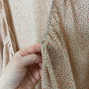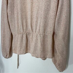 An adorable wrap blouse with a button on one side and tie on the outside. Snap closure on bust is broken, both pieces included just have to sew the one side back on - reflected in price. Elastic on the wrists. Light weight and sheer.