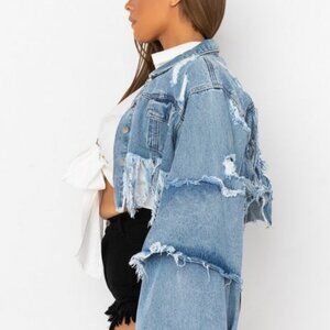 The PLUS AZALEA WANG Ultra Patchwork Cropped Bell Sleeve Denim Jacket is made from a light wash denim fabrication, and is complete with an ultra cropped length, a fringe frayed hemline, long bell sleeves with tiered frayed hem details, distressed back details, two chest pockets, a collared neckline, and a button up closure.