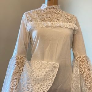 Plus size lace top (1X). Snaps at inner thighs. SUPER ELEGANT💋💋 Polyester body. Beautiful BEAUTIFUL XTRA WIDE BELL SLEEVES. Sleeves spread out to 74” round spread out. 23” long. Amazing lace neckline and gathered above breast. This will be by far the sexiest top you’ll ever own. Wear with jeans; black fitted pants or a denim skirt. Can’t wait to get it home?? ORDER NOW. I SHIP OUT FAST!!