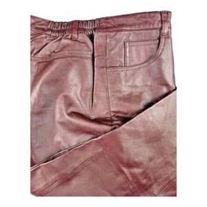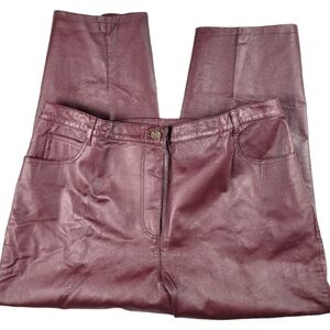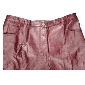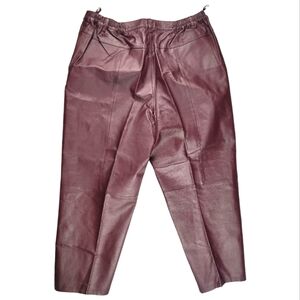 PLUS SIZE LEATHER** Vintage Via Accenti Women's Straight Leg Leather Pants, elastic back waist band, 5 pocket, fully lined, button/zip closure, deep wine in color, 40" waist, 27" inseam, 14.5" rise, previously owned, like new