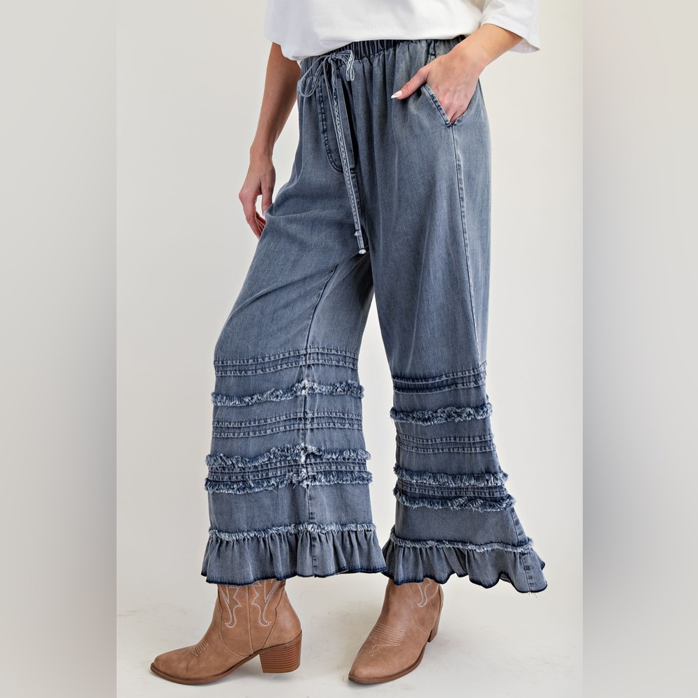 "Yeehaw, these Rodeo Ruffled Pants are the real deal! Made from chambray, they boast a flirty tiered bottom and a wide leg fit. Step out in style and sass with these playful pants. Giddy up!"