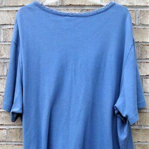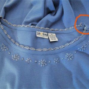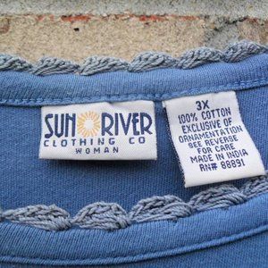 On offer is this Blue Sun River Clothing Co. Tunic with Crochet neck trim and embroidered flowers. Lightly used. Unfortunately the neck edge got caught on hanger and pulled crochet as can be seen on photos. Easy sew-fix though