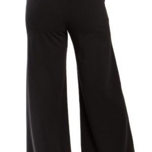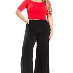 Black plus size wide leg pants with an elastic waistband and pockets. Front side of pants have an outer seam detail.