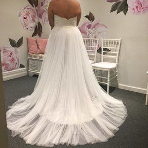 Description: A-line strapless sweet heart plus size wedding gown, made with lace and tulle.