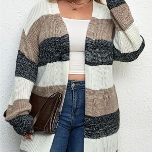 This is a brand new multicolor drop shoulder duster cardigan with the colors cream, tan and black. Gorgeous colors that go together so well. Love this cardigan.