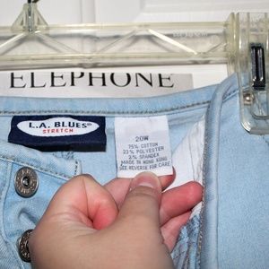 Light blue denim capris by LA Blues, vintage size 20W. Button fly. Five pockets.