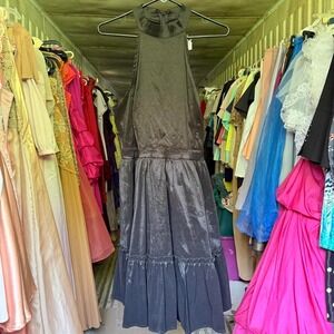 black satin, tiered ruffle, sleeveless, mock neck, evening gown, formal attire, flowy skirt, back zip, elegant, plus size