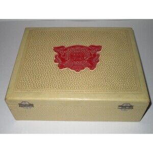 Up for sale is a Vintage PM & Co ~ Phillip Morris ~ Veni-Vidi-Vici Cream Color Cigar Box. This measures approx. 10 3/4" x 8 1/2" x 3 1/4". The outside does have some wear to the edges and corners as well as a few marks in the inside. The rear has a stamp that says Smith crafted Chicago. Makes a great trinket or treasure box.
