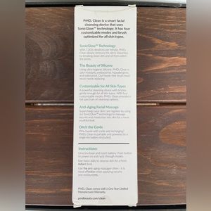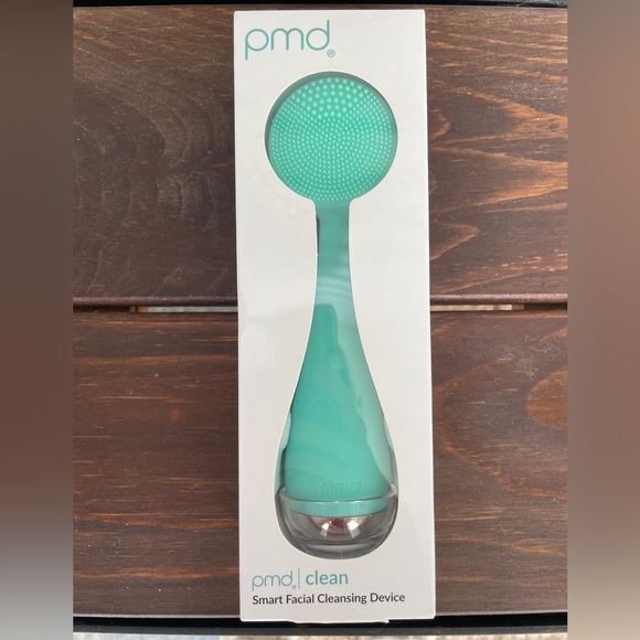 PMD Clean facial cleansing device, new in box, never opened. Teal color with silver finish. Includes a plastic base/stand. 7,000 vibrations/minute. 8” high. Cordless; uses one AA battery (included).